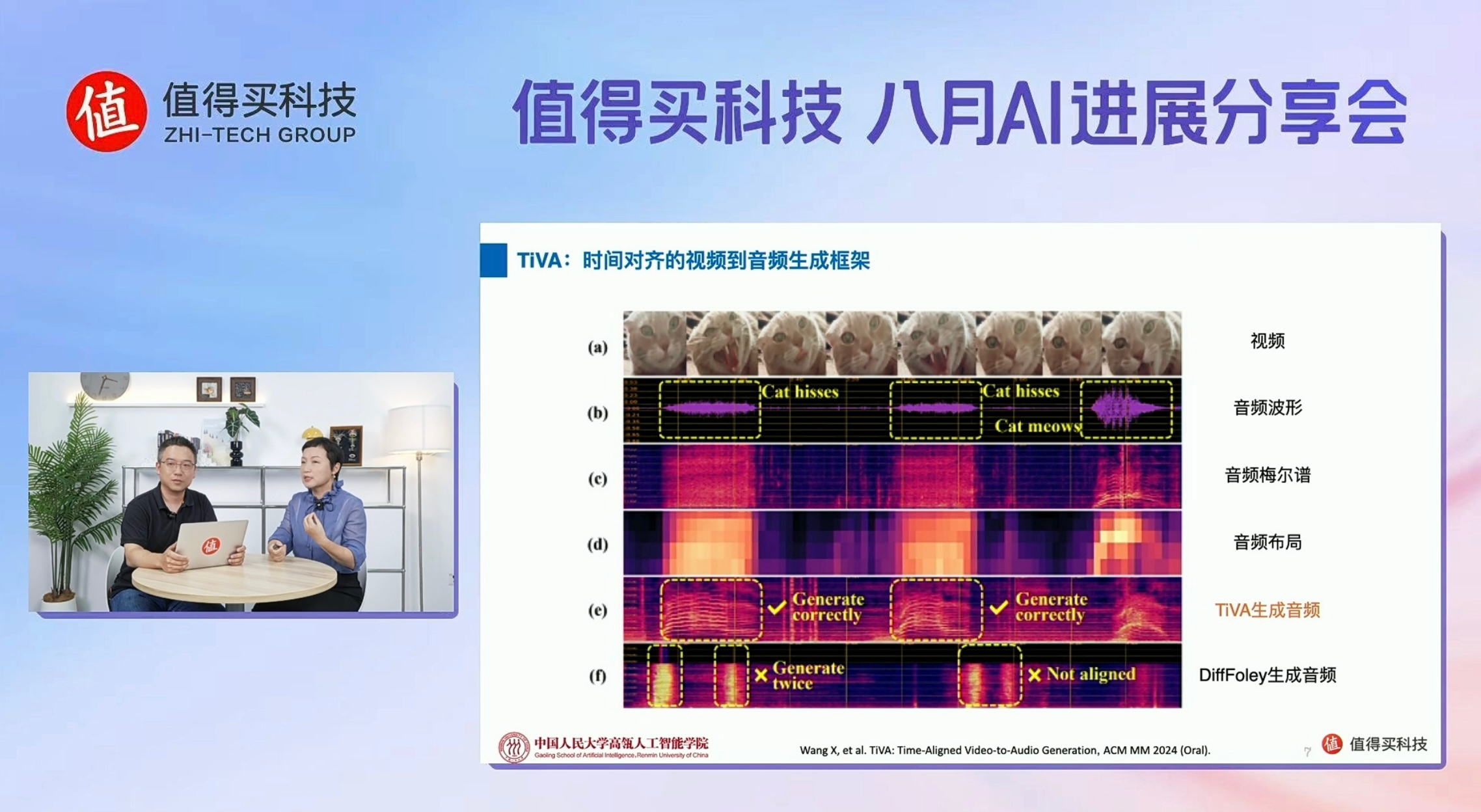分享会现场,宋睿华教授深入浅出地介绍了与值得买科技合作AI研究课题时发现的两个技术难题:如何为无声视频配音以及如何从图片生成有声视频。在为无声视频配音的工作中,宋睿华教授团队提出了使用低分辨率的梅尔频谱作为“音频布局”,提出一个名叫TiVA的新框架,可以先从视频生成音乐布局再用音乐布局影响最终音频的生成,实验结果表明TiVA显著降低了学习的难度,提高了音频的质量和它与视频的同步性。此外,宋睿华教授还以实际案例进行了补充,“以往工作只能为动物园里叫了几声的白头鹰视频配上其他小鸟的叫声,且与张嘴的时机不匹配,TiVA则可以为白头鹰配上与嘴型基本同步的鹰的叫声。”对此,宋睿华教授梳理了视频到声音的三种框架,并提出一种名为VAFlow的全新框架,用视频先验代替以往方法中采样的高斯噪声,让生成的音频成功率更高,与视频中多个声源更贴合,“我们的创新不止于此,我们还率先提出了从一张图像生成有声视频的问题和新方案JointDiT,无需先生成视频再配音。这种一步到位生成有声视频的场景与谷歌前不久发布的Veo 3形式相似,显然更受用户欢迎。”