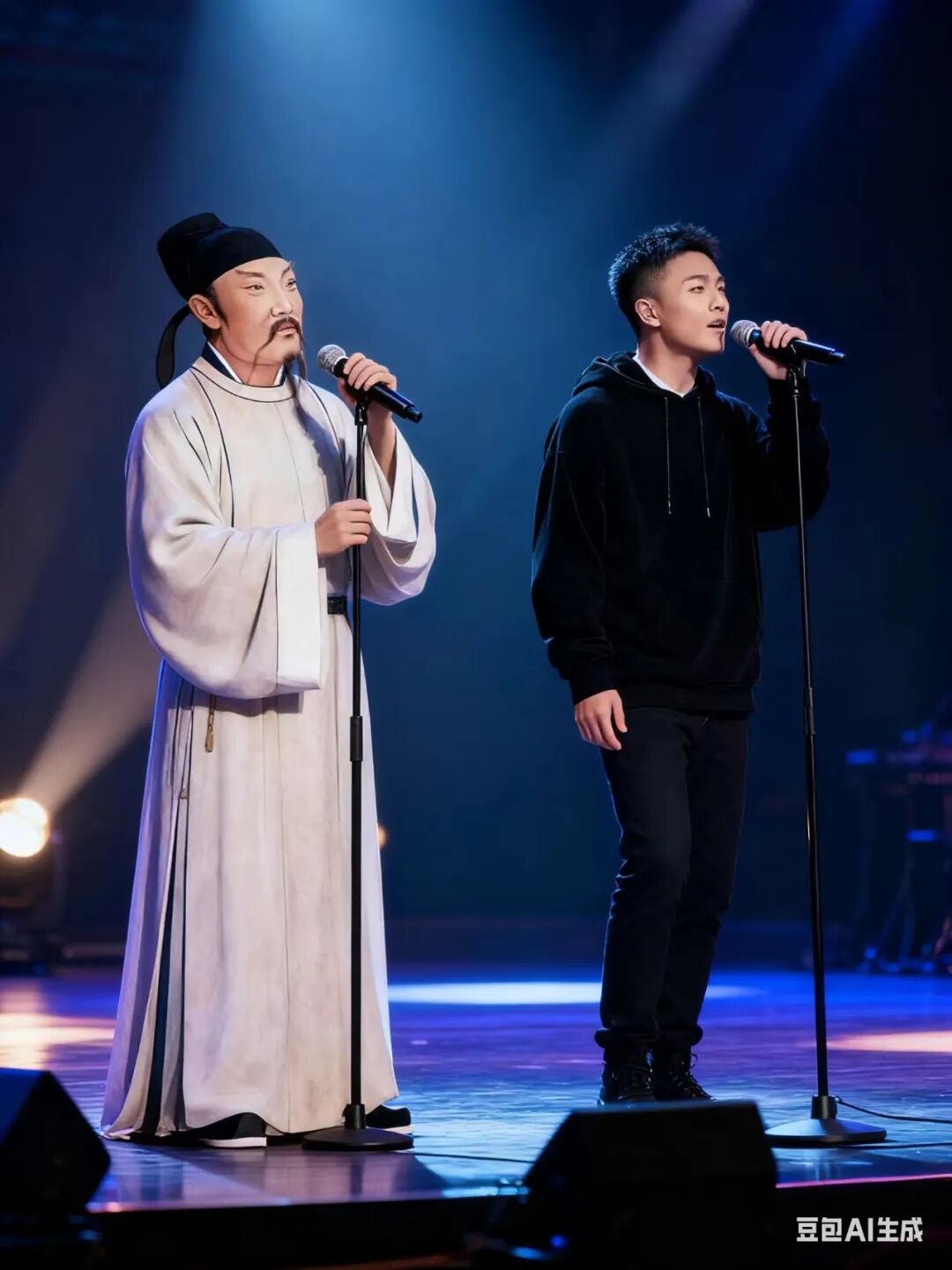 挺好,两只狗在肩并肩走路,金毛脖子上的铁链子和小狗的蓝眼睛都很写实。 那让我们再弄点抽象的,上传李白和李荣浩的照片,想没想过让他俩同台创作呢,输入生成照片为写实风,图一的李白和图二的李荣浩一起在演唱会舞台上唱歌,李白在左边拿着话筒,李荣浩在右边唱歌,原比例。