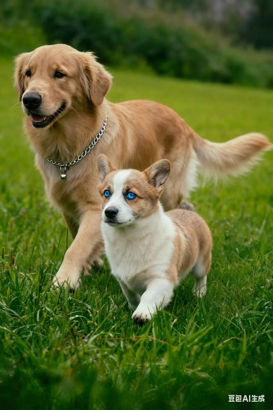 这确定不是一个模子刻出来的吗,画风如此抽象怎么让豆包生成之后怎么也变得可爱起来了。 不仅如此,随手画的胡子的长度和嘴巴的微笑弧度,完美复刻,并且把下方画的很模糊的腿部也给补充完整,连布制沙发的纹理,小猫的影子都生成的一点都不突兀,看来豆包可以拯救我之前的废画了~ 2、多图合成,创意合照的神操作 除了上述可以传一张图外,还能上传多张图。单张参考图的时代慢慢的被淘汰,多图参考才是趋势,多一张图就代表多一种想法,就可以多完成一个任务,不过这并不是说单图的参考生成就要敷衍,而且说不论是单图还是多图都能把握。 上传两张小狗的图片输入“让图1的狗和图2的狗在草地上散步,原比例。”