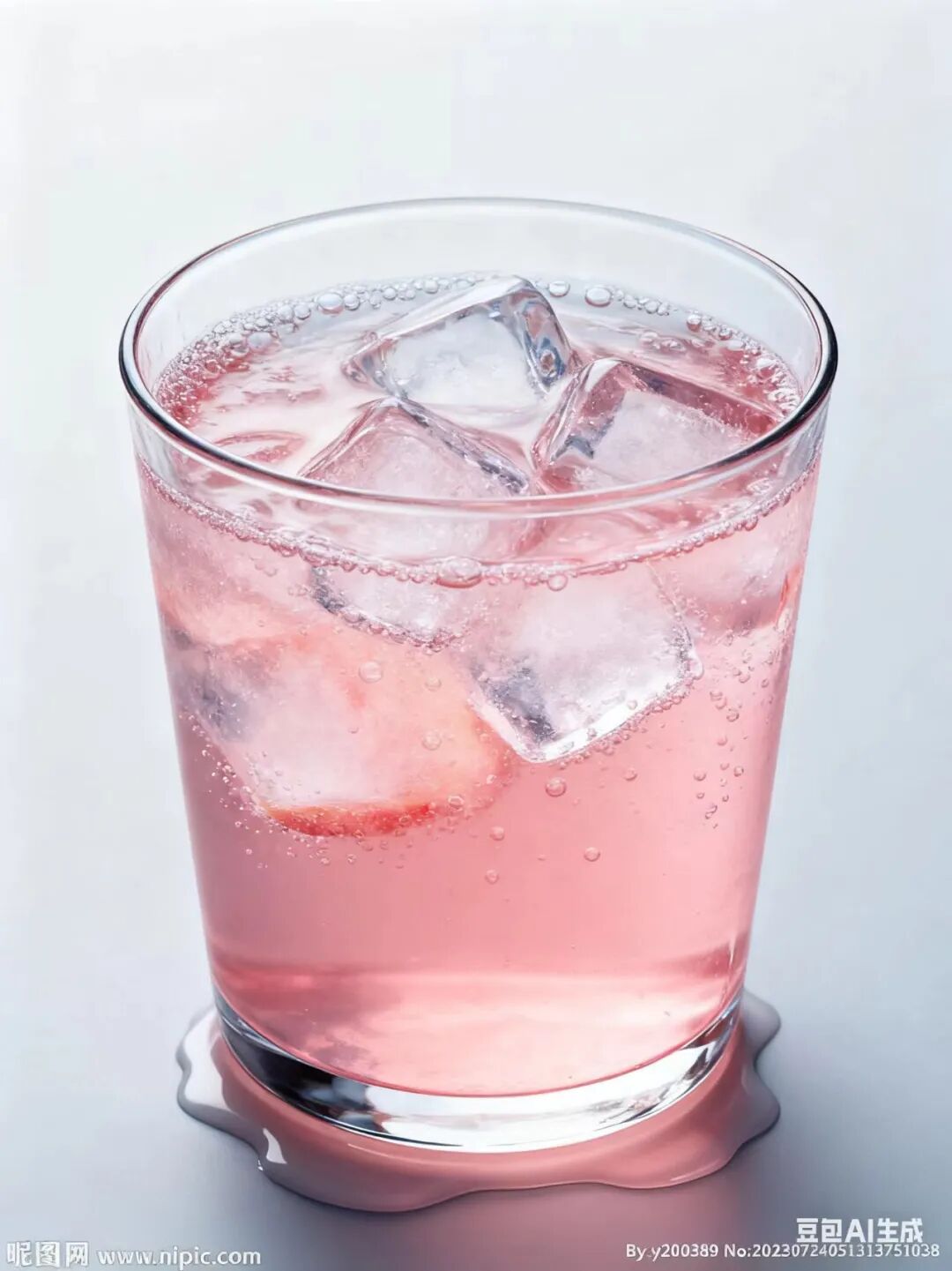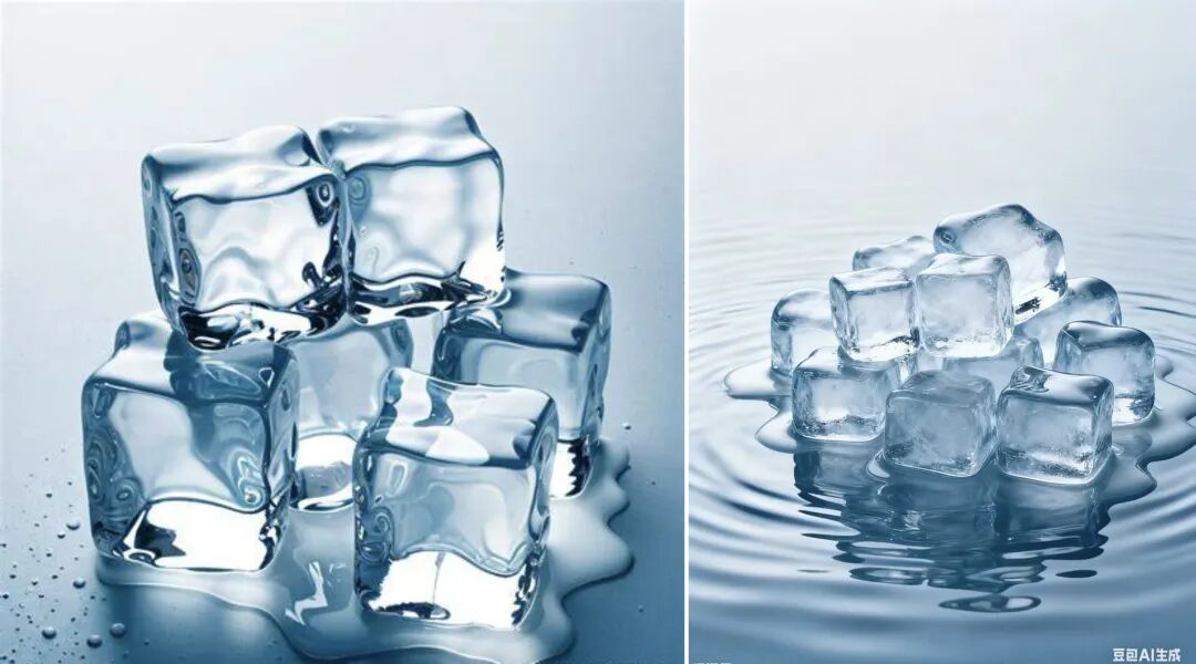 我们看到豆包Seedream4.0理解了半小时的时间概念,也知道半小时后冰块会融化,虽说水确实有一些多,但是效果已经超出预料了。 再输入“把这些冰块放到一杯桃子汽水里,用透明杯子盛着。”