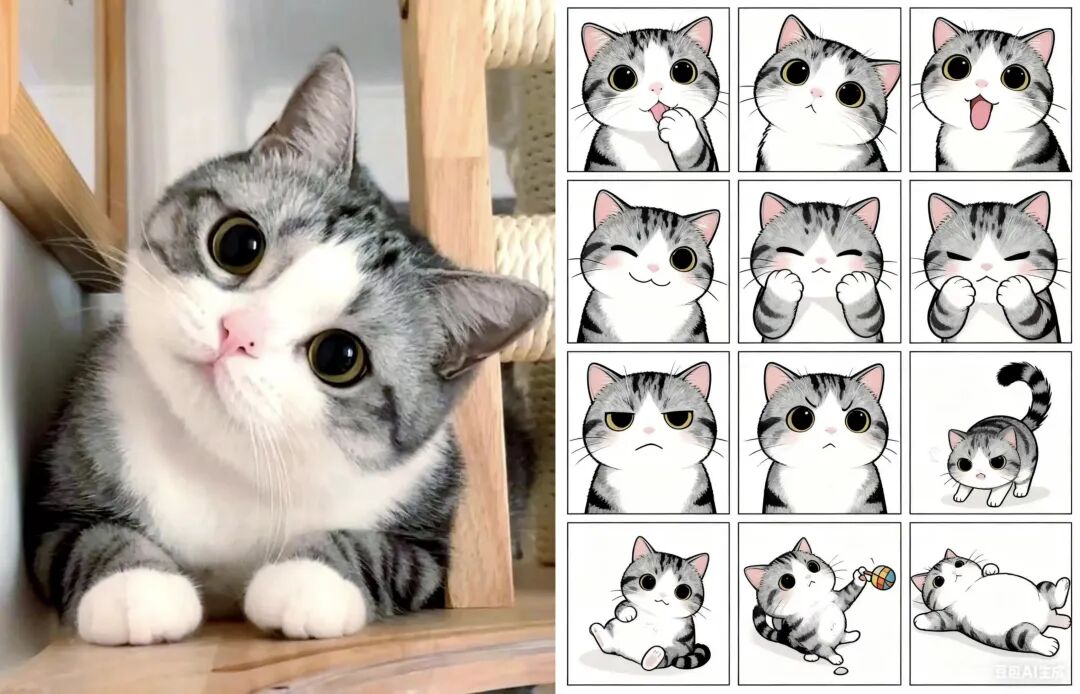 01实测豆包Seedream 4.0,真正的六边形战士诞生了 1、创意周边,从草稿到实体只需要一步 AI创作的一致性一直都是一个难题,其对于大模型的识别能力非常具有考验性,但是这又是贯彻整个设计的重要要求,毕竟谁也不想生成图片后发现可以应用的图片为零。 表情包组合大家应该用的不少,但是有没有想过设计一套属于自己的表情包,上传一张可爱起司猫的图片,输入要求:帮我创作一张图片,图片内包含表情、姿势不同的九宫格表情包,原比例。