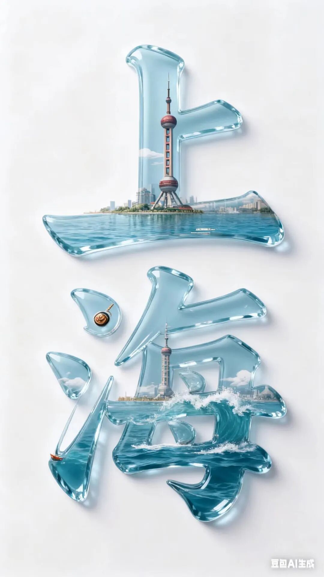 我们看到豆包的设计了一个金色渐变的笔迹,有点自己的想法,下方还有一些签字的笔渍,非常细节了好像刚签上的一样。 4、商业实操,实用性才是第一要义 除了上述的一些创作,能够在生产使用场景中得到运用也是很重要的,毕竟满足生活创作和产业使用都是大模型不断升级的推动因素,在各种领域都离不开创作。 下面让我们设计一个城市宣传图,输入用晶莹剔透的3D创意字体设计,插画海报,白色背景,文字“上海”,“上”字内笔画嵌入上海的特色物品,“海”字内笔画于海,特色建筑,体现了上海在城中、城在海中,高品质,2k。原比例。