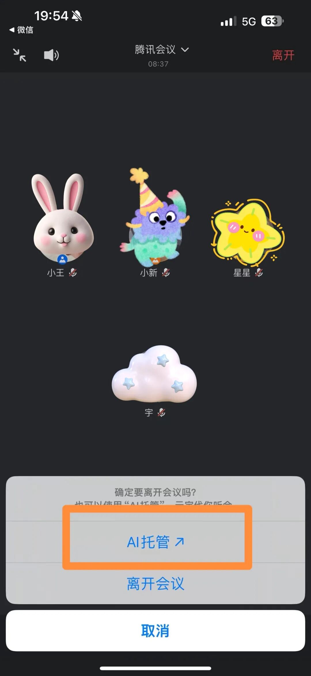 02 AI托管,卑微打工人全面开挂 一圈用下来,我最大的感受是,腾讯会议并没有追求那些华而不实、炫技的AI功能,而是于小处着眼,死磕每一个微小的、让用户“说不出口又确实很烦”的痛点。 比如,有帮打工人开会、刷视频、记笔记的“AI托管”,简直是独家AI秘书。如果你开会时间OK不冲突,会中用AI纪要就好,但如果时间冲突了,在会前拿到了会议链接,那就要祭出黑科技:AI托管。