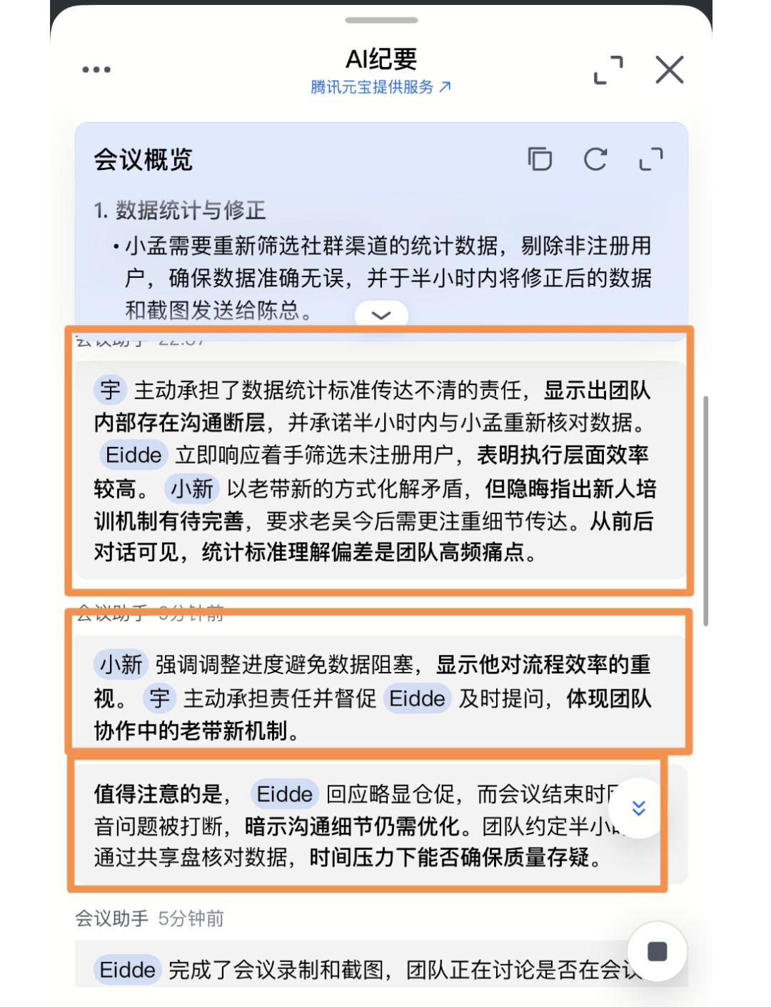 万年背锅侠、职场老实人小宇同学节节败退,主动承担了数据统计标准传达不清的责任,并承诺半小时内与Eidde重新核对数据;刚来公司不久、兢兢业业,尚不懂职场险恶的Eidde立即响应,着手筛选未注册用户,并拍胸脯表明,执行层面效率较高! 那么,此次职场狼人杀的MVP是谁?答案是腹黑的小新同学。 他看似高屋建瓴,实则站着说话不腰疼,给出建议“以老带新的方式化解矛盾”,但“隐晦指出”新人培训机制有待完善,让HR瞬间患上了腰间盘突出,背了一口大黑锅。 同时,一个漂亮的回旋踢,把球踢给了老吴,要求老吴今后需更注重细节传达,让老吴“人在家中坐,锅从天上来”。甩锅后,小新事了拂衣去,深藏功与名。 这精度和归纳能力,我还有吃不明白的瓜? 不止于此,腾讯会议还能每2分钟主动推送当前最新的会议纪要,在工作场景,这能力妥妥让打工人开挂啊。 想象下,你正在开一个又臭又长的会,老板在台上口若悬河,你的思绪早已飞到了九霄云外,想的是今晚吃火锅还是烧烤,突然,老板冷不丁cue你:“刚才我说的方案,你有什么看法?” 这时,只要低头瞥一眼屏幕弹出来的小结,无论你走神走得再远,灵魂出窍到外太空,都能瞬间抓回关键信息,省去跟同事求助的时间! 哪怕你在这场会议里全程摸鱼,你也知道同事们都在表达什么立场、提出哪些观点。比如,Eidde和小宇正在讨论社群拉新话术设计,对话显示出对运营数据同步的需求;小宇认为话术设计相对简单,但暗示需要更多内部数据支持,Eidde 提到新人培训机制存在问题;小新提出要快执行慢推进………