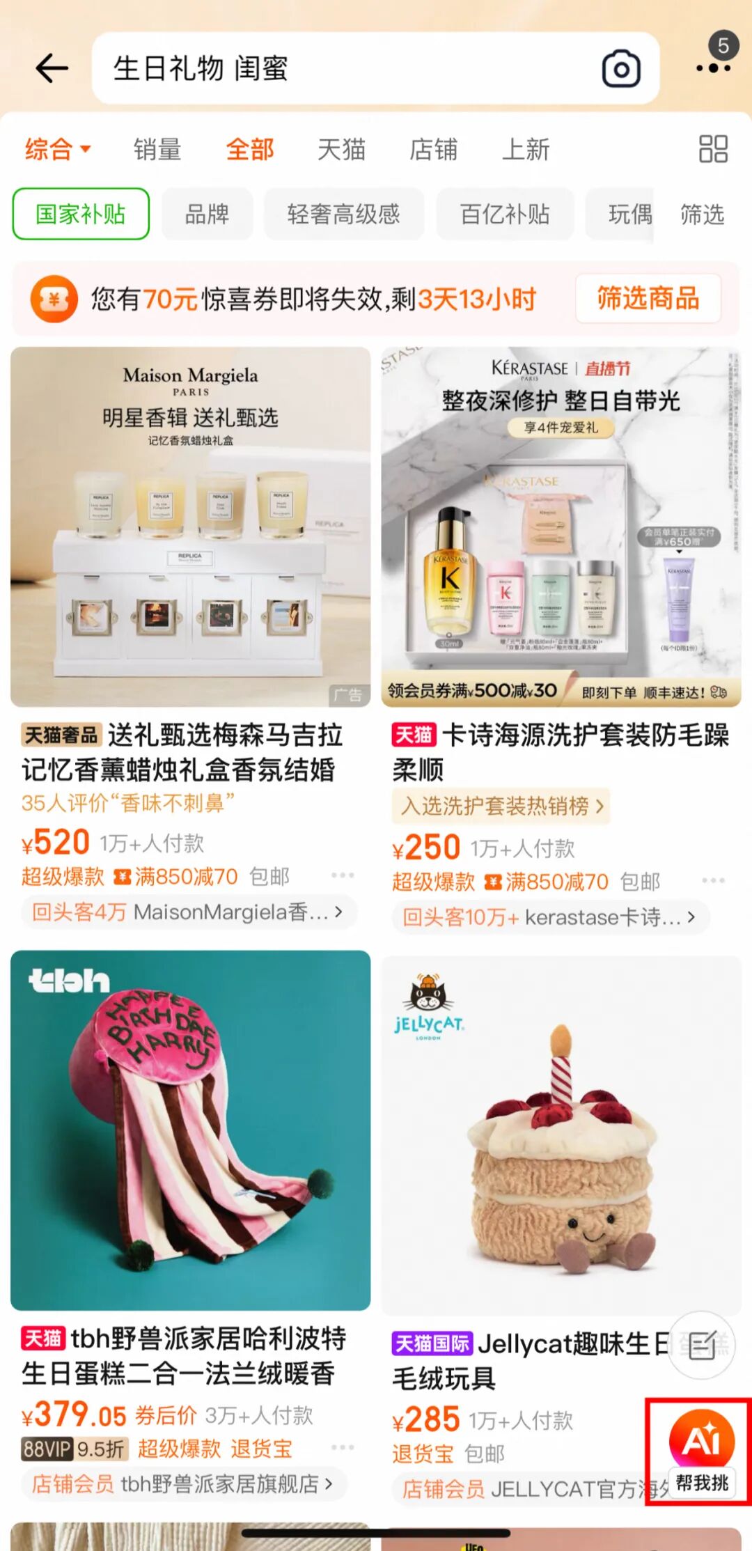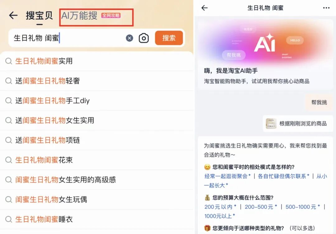 扫街榜不仅是一份榜单,而是多个细分维度的组合,并且每日动态更新。这背后需要AI对海量数据进行实时计算和排序。比如,“本地人爱去榜”能快速凸显城市居民的真实偏好,而“城市特色榜”则有助于外地游客捕捉差异化体验。AI的作用不仅是算分,更是不断让榜单保持鲜活。 扫街榜能够成立,还依赖于高德自身AI化的演进。今年8月,高德宣布全面AI化,升级为“出行生活智能体”,从被动响应转向主动推荐。短短一个月,高德AI推荐的日均生活服务点位已超过6300万个。这意味着,扫街榜并不是孤立存在,而是嵌入了“推荐—验证—反馈”的AI闭环,AI推荐目的地,用户行为反馈再验证推荐效果,榜单数据反过来优化推荐。 与此同时,高德推出“烟火好店支持计划”,投入超10亿元补贴,覆盖出行券、消费券和流量曝光,每天希望为线下带去1000万新增客流。发布当日,首批2962家“烟火小店”上榜,覆盖全国61个城市。 媒体现场的提问,也反映出外界的敏感点:一方面是榜单机制是否透明,另一方面是高德在本地生活服务的商家运营能力能否跟得上。高德的回应是通过算法透明度、信用体系和补贴扶持,来增强商家信任感。但更深层的意义在于:AI不仅在提升效率,更在重建商业信任。 这背后的逻辑,与阿里系另一条主线,通义大模型正在发生的变化,形成了呼应。 02 AI正在悄悄渗透阿里系每一条业务线 通义大模型正在渗透阿里系的每条业务线。早在2023年4月,阿里巴巴就宣布所有产品将接入通义千问大模型进行全面升级。 淘天集团作为阿里的核心电商业务,其AI化聚焦于重塑用户体验和商家运营模式。通过AI技术优化搜索推荐、智能客服等环节,并探索利用AI创造新的用户入口。 近日,淘宝推出的AI工具“AI助手”,主要具备“智能导购”的能力,产品目前已经上线淘宝,入口位于淘宝App搜索结果页右下角icon及信息流卡片。