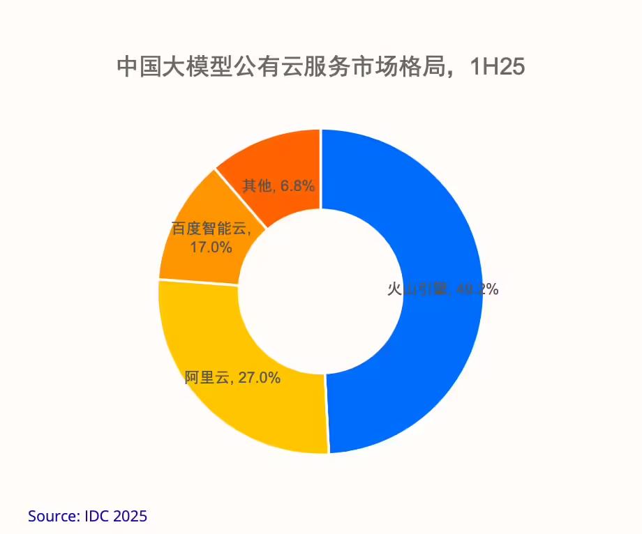 IDC 报告指出,2025 年上半年火山引擎在大模型调用量上以 49.2% 的占比领跑中国市场,2025 年上半年调用量同比暴涨 398.2%。火山引擎凭“调用量第一”突围。背靠字节跳动的生态,它在AIGC、视频、文案生成等场景形成高频使用闭环,用流量热度抢认知。