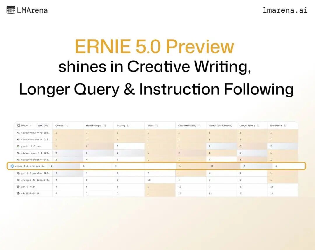 作者|冰拿铁 编辑|星奈 媒体|AI大模型工场 当硅谷还在讨论GPT-5时,一份来自大模型竞技场LMArena的排名,让海外开发者社区突然将目光投向了北京。 全球知名的大模型“竞技场”LMArena最新数据显示:文心全新模型ERNIE-5.0-Preview-1022首次上榜,就登上了文本排行榜全球并列第二、中国第一,超越了被寄予厚望的GPT-5-High。尤其在创意写作、复杂长文本理解、指令遵循三项,得分亮眼。