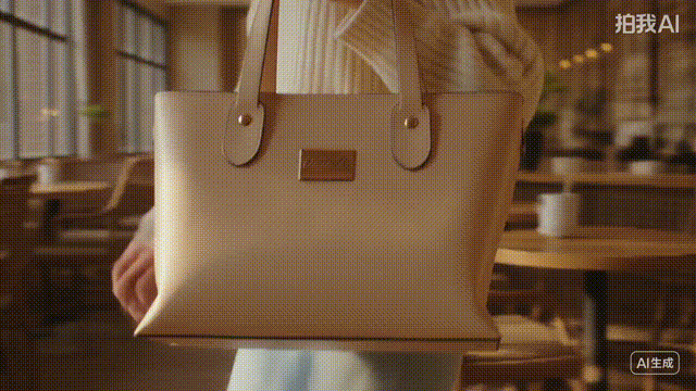 当然,当技术能够稳定地讲述一个有趣的故事时,它的下一站必然是广阔的商业天地。拍我AI V5.5展现出的能力,已经清晰地指向了商业化应用这座富矿。 我们通过模拟两个常见的商业广告案例,来窥探其潜力。 第一个是包包广告片。我们输入了“生成一个包包的宣传片”的指令,并提供了参考图以确保主体可控。可见,生成的视频完全达到了可直接使用的专业水准: