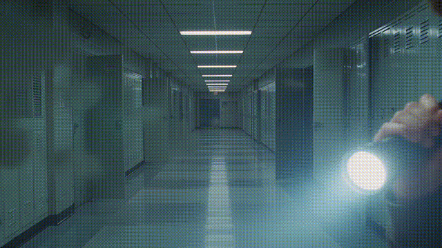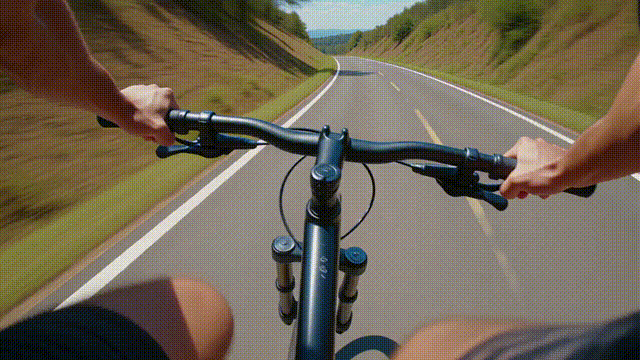 镜头一,夜色走廊的灯光闪烁、柜门震动,手电光柱与低频合成器音效将紧张感瞬间拉满,一名少年拿着手电,小声:“你听到了吗?那声音……又出现了”;镜头二,切至教室,墙面如心跳般起伏扭曲,手电光扫过时纹理的扭曲细节和金属刮擦声的处理堪称专业;镜头三,墙壁裂开,红光溢出,风压卷起纸张,音乐急速升高,直至一个影子探出,少年惊喊:“快跑!” 整个视频的镜头切换流畅,景别从全景到特写变化自然,声音与画面严丝合缝,共同推进了“发现异常-危机逼近-怪物现身”的完整故事线。 下一个指令,则重点考察大模型对运镜的理解,我要求AI生成一段包含第一人称视角、侧后方跟拍和无人机俯拍的多镜头骑行视频。 成果同样出色: