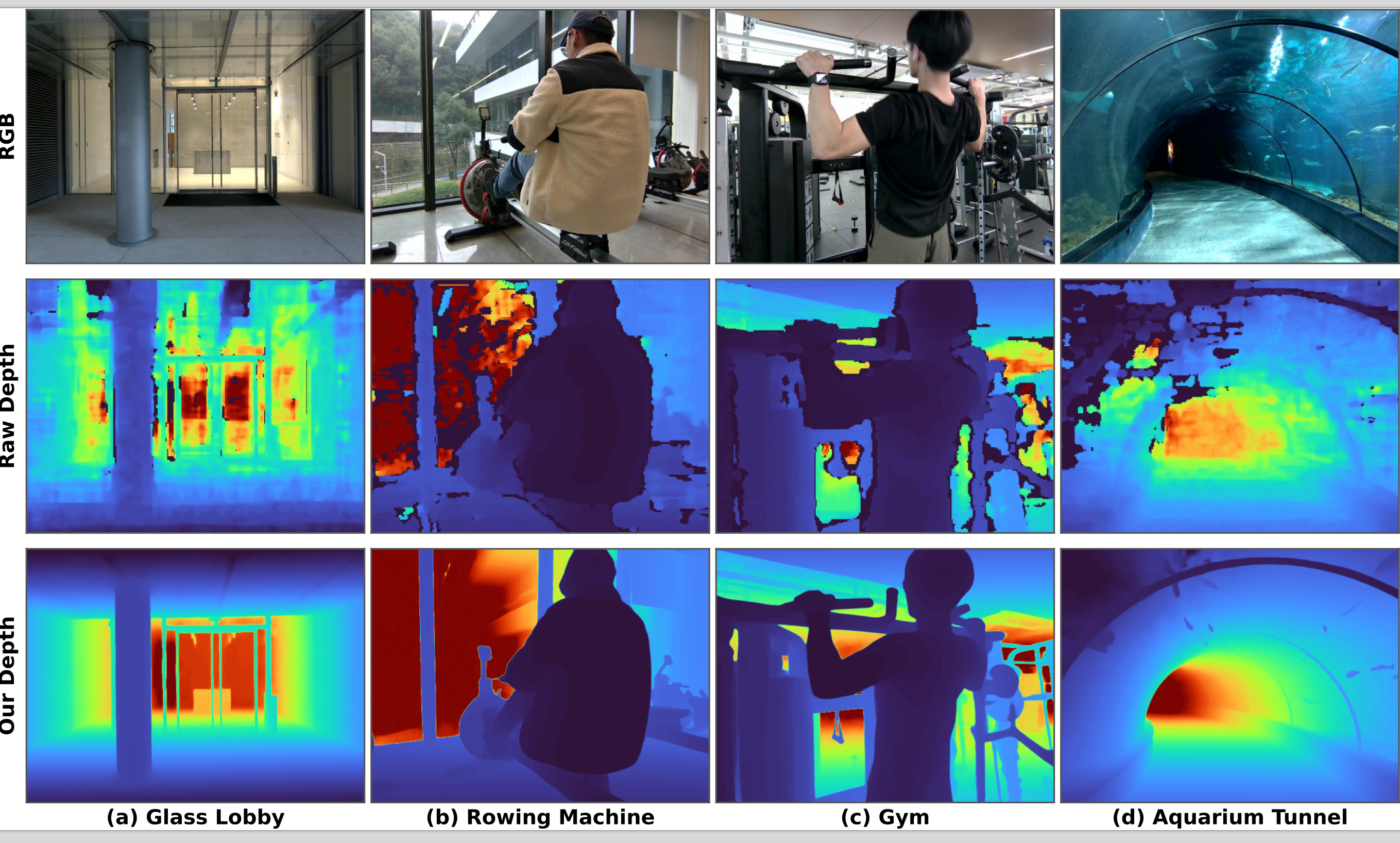 实验中,奥比中光 Gemini 330 系列在应用LingBot-Depth 后,面对透明玻璃、高反光镜面、强逆光及复杂曲面等极具挑战的光学场景时,输出的深度图依然平滑、完整,且物体的轮廓边缘非常锐利,其效果显著优于业内领先的3D 视觉公司 Stereolabs 推出的 ZED Stereo Depth 深度相机。这意味着在不更换传感器硬件的前提下,LingBot-Depth 可显著提升消费级深度相机对高难物体的处理效果。