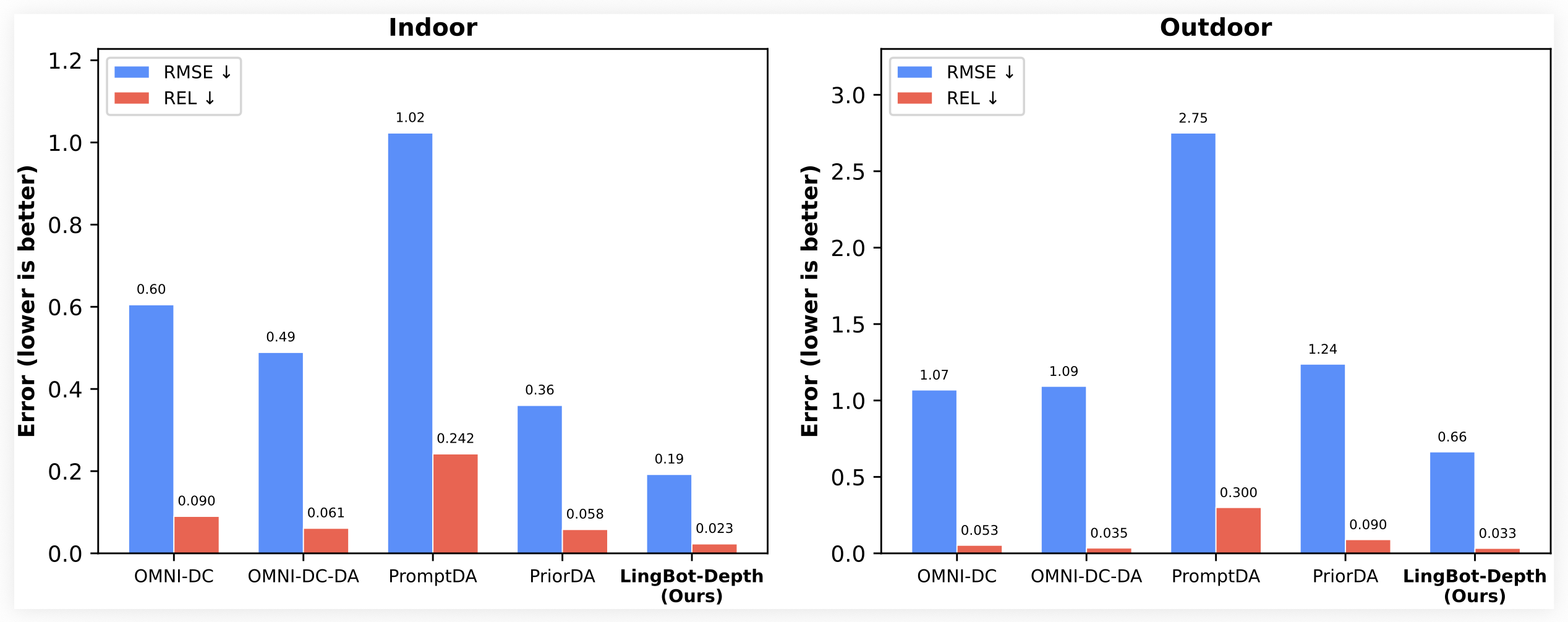 在NYUv2、ETH3D等权威基准评测中,LingBot-Depth展现出代际级优势:相比业界主流的 PromptDA与PriorDA,其在室内场景的相对误差(REL)降低超过70%,在挑战性的稀疏SfM 任务中RMSE误差降低约47%,确立了新的行业精度标杆。