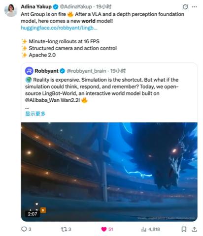 03 改变世界模型的产业路径 长期以来,世界模型更像是一种巨头内部的研发资产,而非行业公共能力。训练环境高度专有、成本高昂;模型能力难以复现;中小团队即便具备想法,也难以进入实质探索阶段。这种结构,限制了世界模型的应用节奏,也放慢了具身智能整体的发展速度。 蚂蚁灵波此次开源的深层意义,在于它主动选择了一条截然不同的产业路径。 与Genie 3不同,Genie 3是闭源的,因而社区无法基于它进行开发和迭代,因此如果学术团队或初创公司想用此训练一个高质量世界模型,门槛极高,而LingBot-World则将完整代码与权重直接交付开发者,目标并非展示能力,而是进入真实工程链路,全球社区都能依此打造无限可玩的下一代虚拟世界。 这一选择,在国际上引发了深刻共鸣和战略层面的解读。“这对整个行业都是变革”,德国最大的财经网站之一AdHocNews在报道中指出,“蚂蚁集团正在成为不断增长的人形机器人和物理AI市场中的核心推动者。这对于行业的意义可能是深远的:从物流和制造业到医疗保健乃至个人辅助,开发者们突然获得了以往只有大型企业才能使用的工具。特别关键的应用,如自动驾驶或外科手术,将受益于像LingBot-World这样的安全训练环境。”